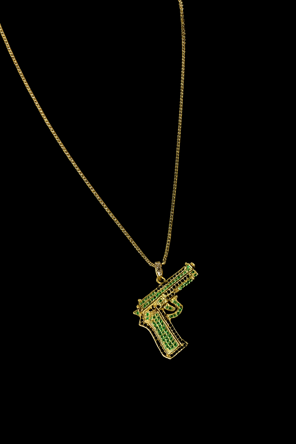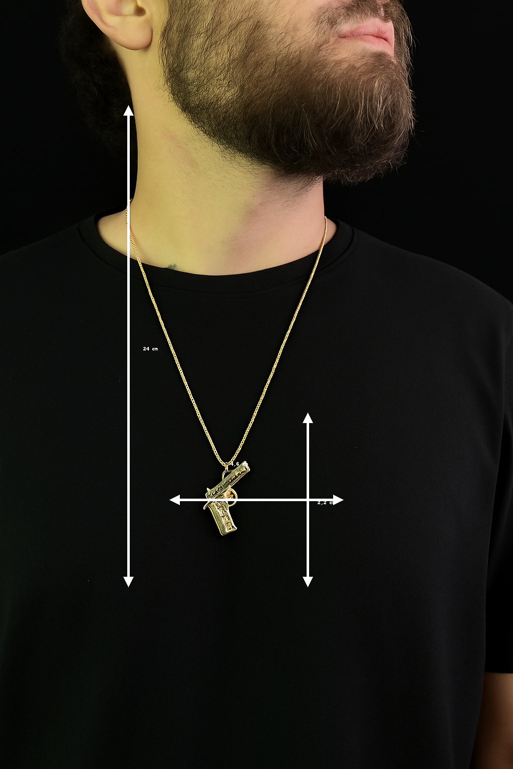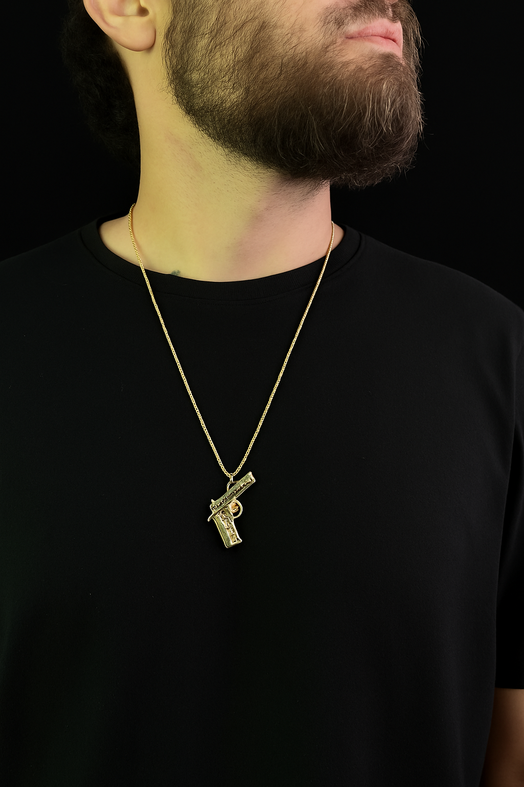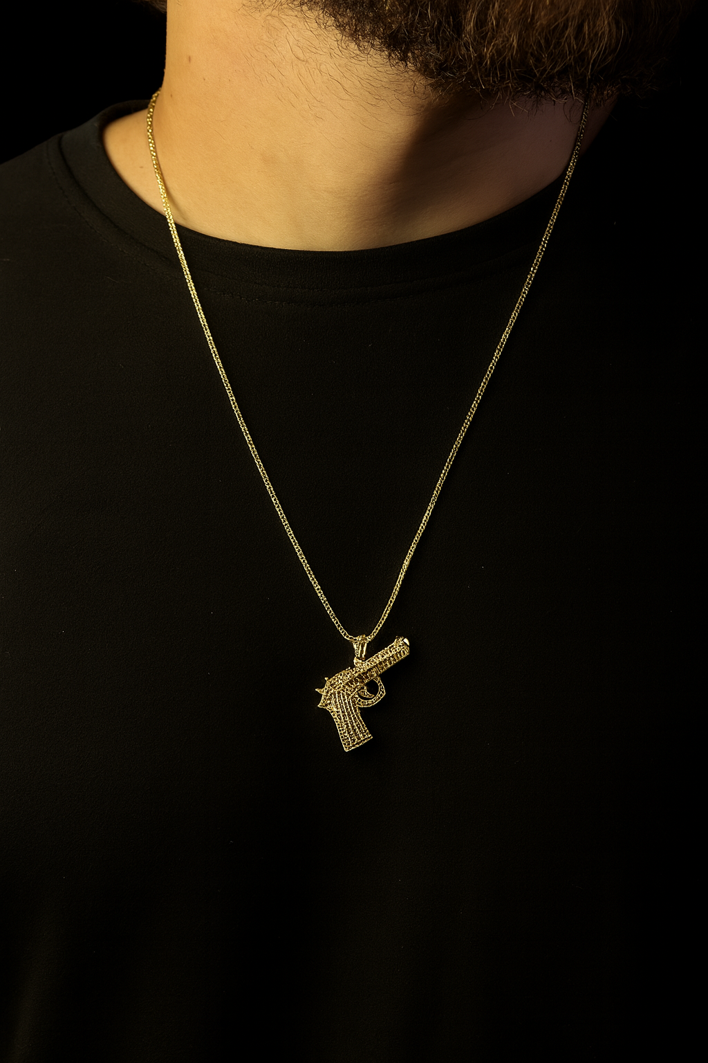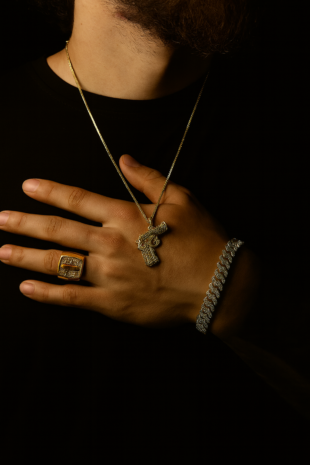 El dije de pistola con incrustaciones y la pulsera de eslabones brillantes transmiten personalidad, confianza y un look premium.
